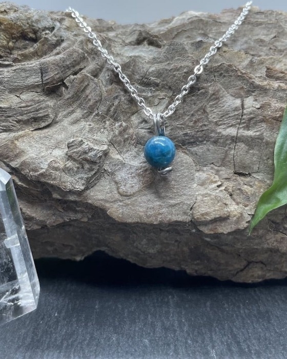 Ce collier de 40 cm est composé d'une pierre d'apatite, la pierre de la motivation et de l'équilibre par excellence. Associée au chakra de la gorge, cette pierre bleue naturelle facilite la communication et l'expression de soi.