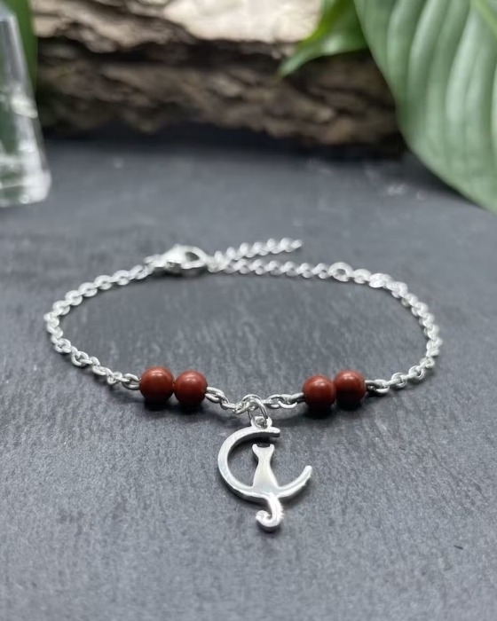 Bracelet de 13,5 cm (extensible jusqu'à 18,5 cm) avec un pendentif chat. Le chat, en tant qu'animal totem, est associé à la patience et au courage. Il symbolise l'indépendance et la sociabilité, et encourage à trouver le juste équilibre entre des forces opposées.